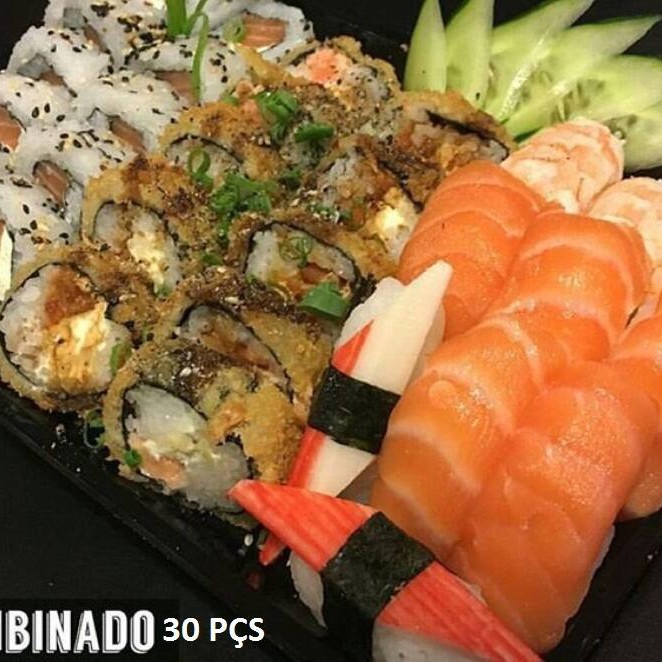 30 Peças: 08 niguiris de salmão, 10 uramaki filadélfias, 08 sashimis salmão, 4 joys salmão