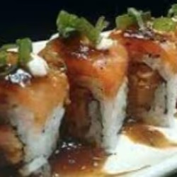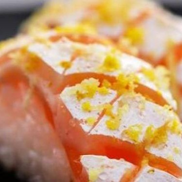 Enrolado de arroz, kani, salmão e cheese, coberto com salmão e geléia de morango.