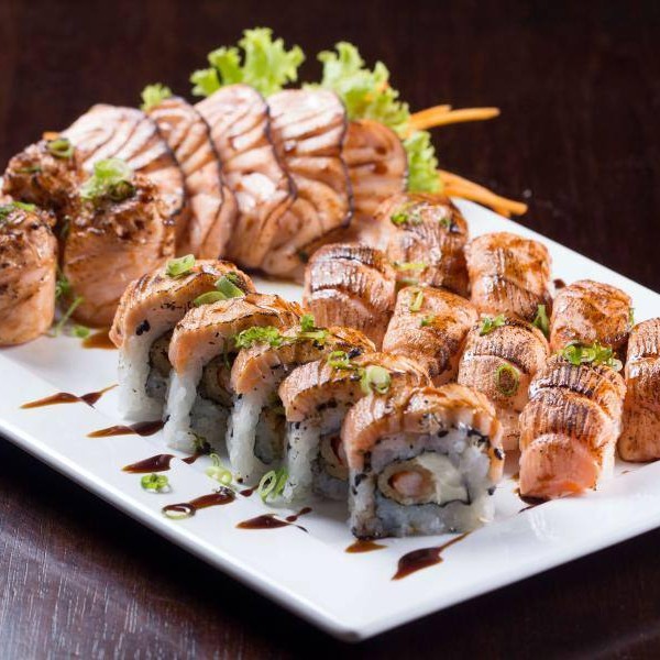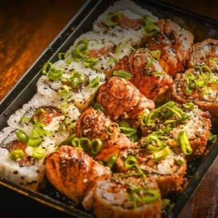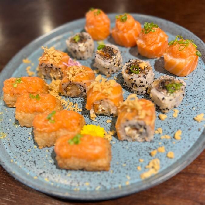 5un ura ebi especial, 8un niguiri de salmão 5un sashimi salmão, 4un joy de salmão. (todos maçaricados)