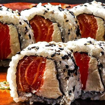 Enrolado de arroz e gergelim, recheado com salmão e cheese