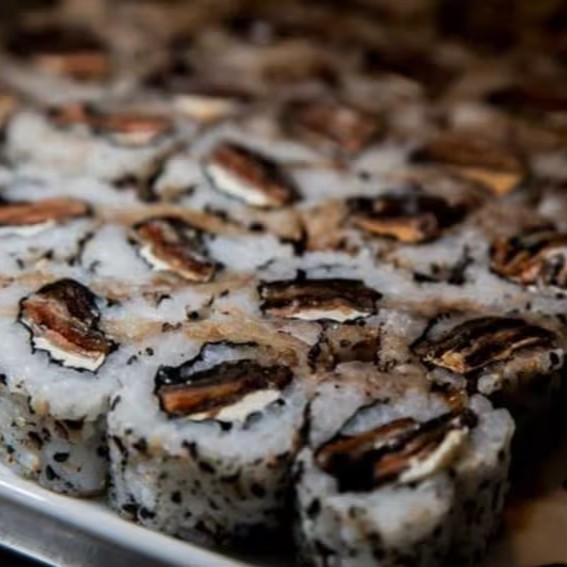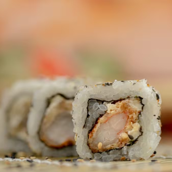 Enrolado invertido de arroz e gergelim, recheado com camarão e cheese