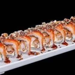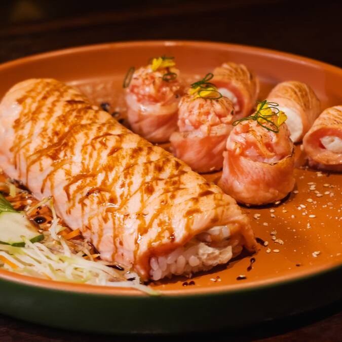 Enrolado coberto com salmão, recheado de cheese e camarão empanado