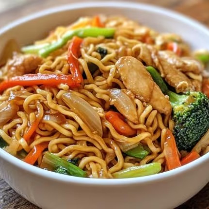 Macarrão , fatias de frango, legumes , shoyu e óleo de gergelim