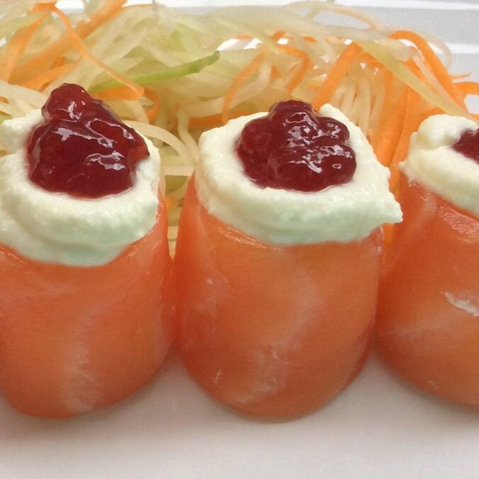 Enrolado de salmão e arroz com cheese e geleia de morango
