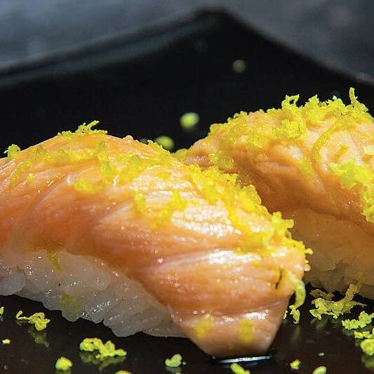 Niguiri de salmão com raspas de limão siciliano e azeite