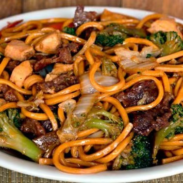 Macarrão , fatias de carne, frango, legumes , shoyu e óleo de gergelim
