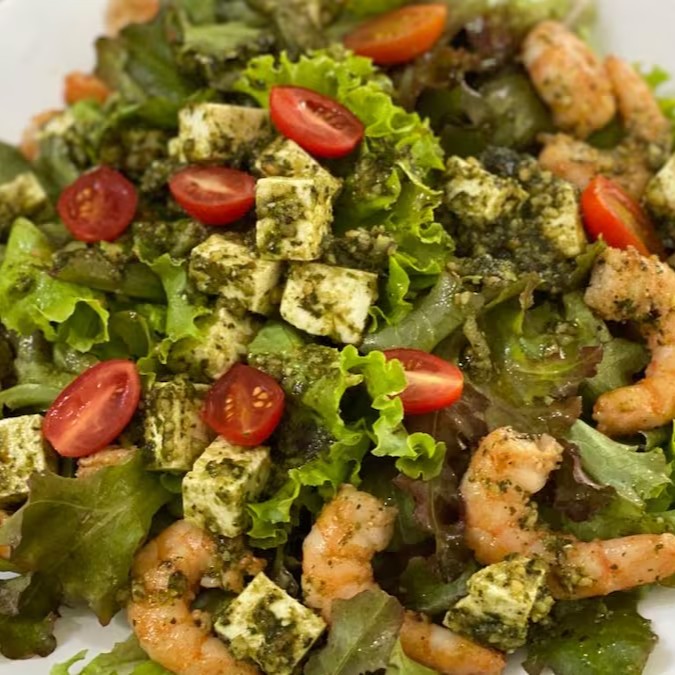 Mix de folhas, camarões cozidos, tomate cereja, molho pesto.