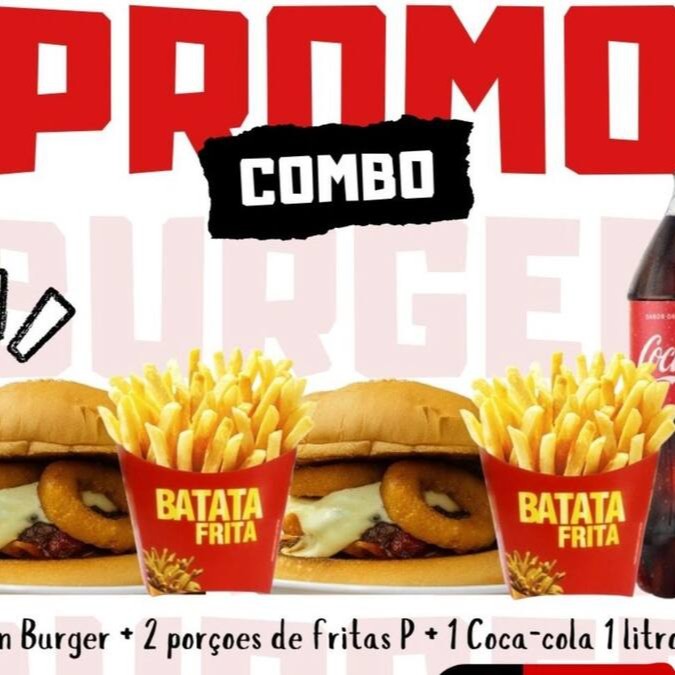 2 hambúrgueres Onion Bomba (pão artesanal, blend suculento de 120g — peso in natura, cebola caramelizada no shoyu, maionese especial da casa, molho barbecue, onion rings crocantes e queijo derretido) + 2 porções de batata frita P + 1 Coca-Cola de 1l.