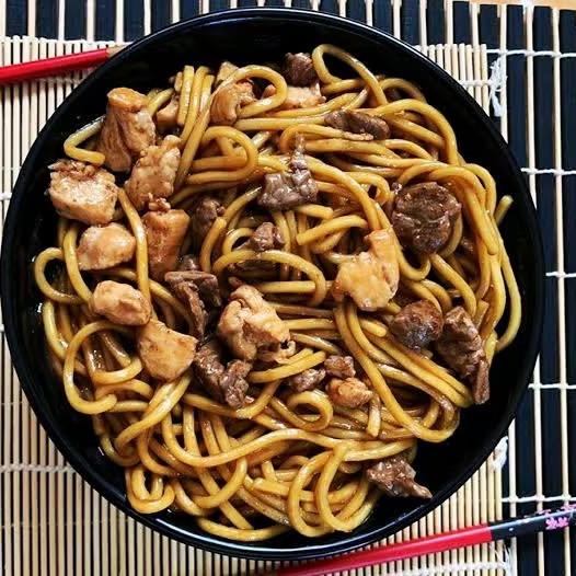 Yakisoba! Macarrão ao ponto, legumes crocantes e frango e carne macios, tudo envolvido em um molho especial. Aproximadamente 500g