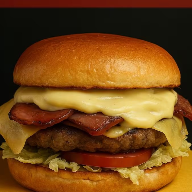 Um verdadeiro clássico bombástico: Pão brioche dourado e macio, blend artesanal de 120g (in natura) preparado na hora, duas camadas generosas de cheddar derretido, tiras crocantes de bacon e cebola caramelizada no ponto certo, trazendo aquele contraste agridoce irresistível. Finalizado com o nosso molho especial da casa, esse é o hamburgão que vai explodir no seu paladar!