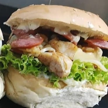 PÃP BOLA, FOLÉ DE FRANGO, MUSSARELA, OVO, BACON, SALADA, BATATA PALHA E CREME ESPECIAL