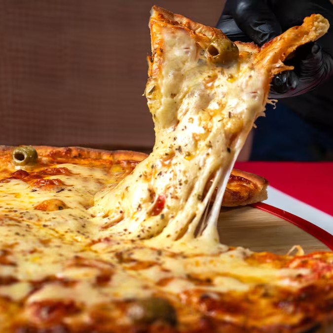 Deliciosa pizza com queijo mozarela, Catupiry e cheddar.