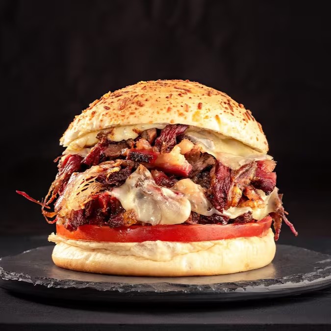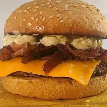 Pão selado na chapa, burguer artesanal, queijo, cebola chapeada, maionese e barbecue da casa e bacon.