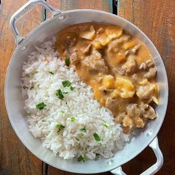 Delicioso strogonoff de carne ou frango com arroz refogado.