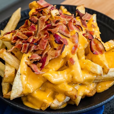 Batata frita temperada cheddar e bacon