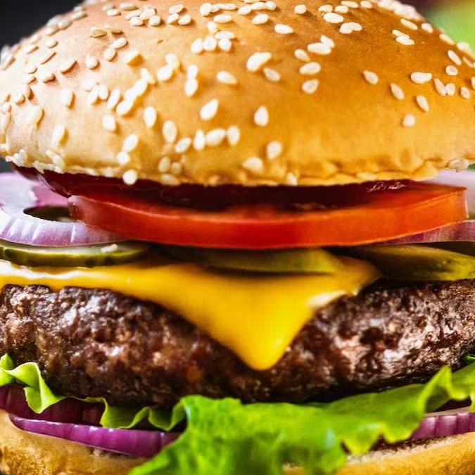 Pão com gergelim, burguer artesanal, queijo, salada, maionese da casa, cebola caramelizada