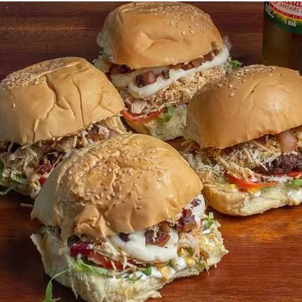 São 05 X-Tudo: Pão com gergelim, burguer artesanal, maionese da casa, ovo frito, salsicha, bacon em tiras, mussarela, calabresa, coalho, alface, tomate e cebola caramelizada