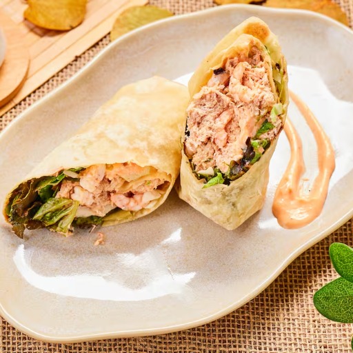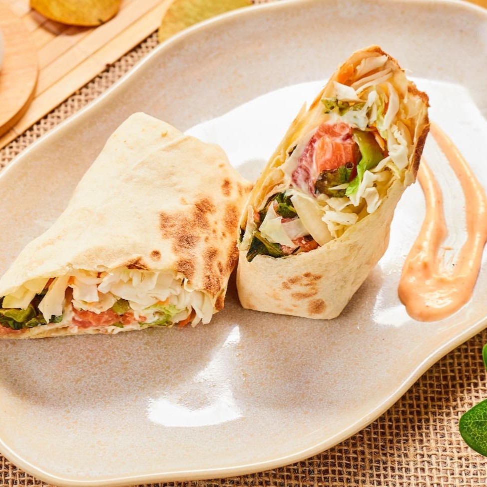 Um wrap cheio de sabor e frescor! Tortilha recheada com alface, repolho, cenoura, pasta de salmão grelhado, camarões cozidos e molho spicy. Crocante, leve e delicioso!