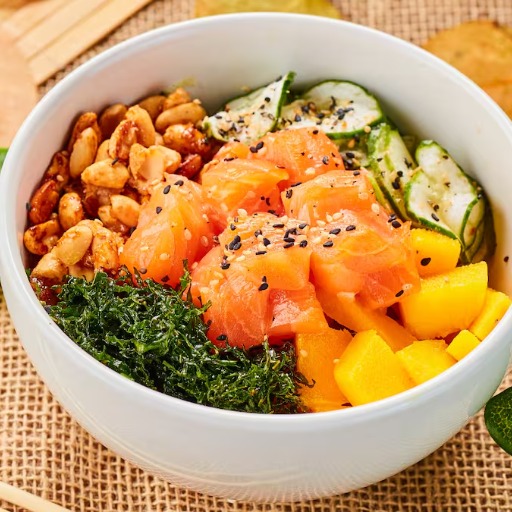 Pasta de salmão cremosa, combinada com manga doce e sunomono de pepino japonês. Cebola roxa, cenoura e alho-poró crocante completam esse poke que é um verdadeiro festival de texturas.