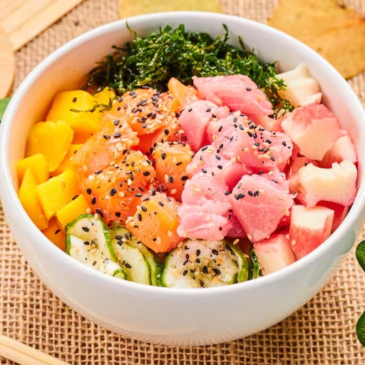 Não dá pra escolher entre atum e salmão? A gente junta os dois pra você! Com sunomono, manga, kani, crispy de couve e shari, esse poke é uma explosão de sabores!