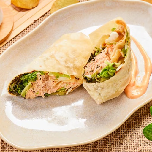 Salmão grelhado nunca foi tão bom! Esse wrap combina alface, repolho, cenoura e uma pasta de salmão grelhado super saborosa, tudo envolvido em uma tortilha macia e acompanhado de molho spicy.