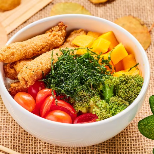 Filé de tilápia empanada e super crocante, com brócolis, manga e tomate cereja. Tudo equilibrado com couve crispy e arroz de sushi. Um poke que é pura perfeição!