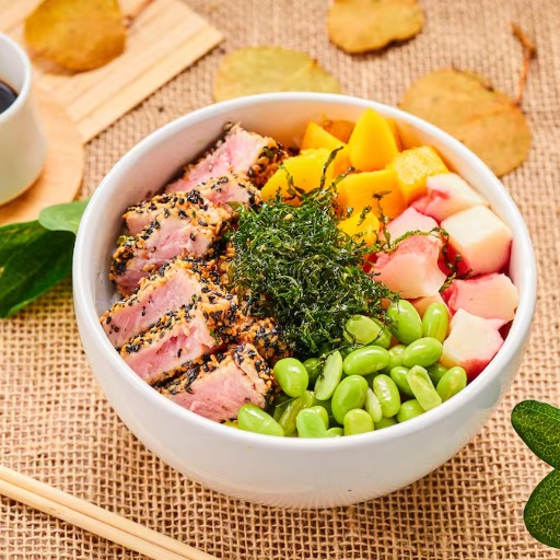 Atum selado com gergelim e especiarias, combinando perfeitamente com manga, shari (arroz de sushi), edamame, kani e um toque de gergelim moído. Para finalizar, crispy de couve, garantindo textura e sabor a cada garfada.