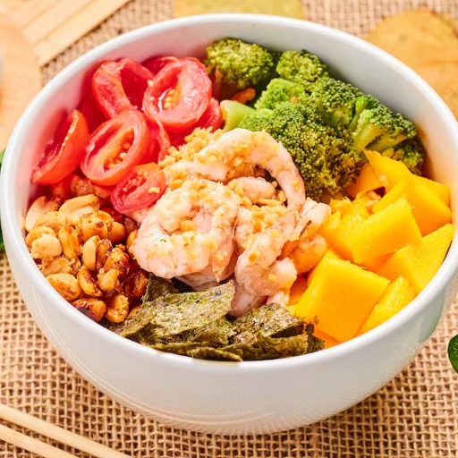 Camarões grelhados no alho, acompanhados de brócolis, manga e tomate cereja. Tudo isso sobre uma base de shari e finalizado com nori e amendoim caramelizado. Um mix de frescor e crocância!