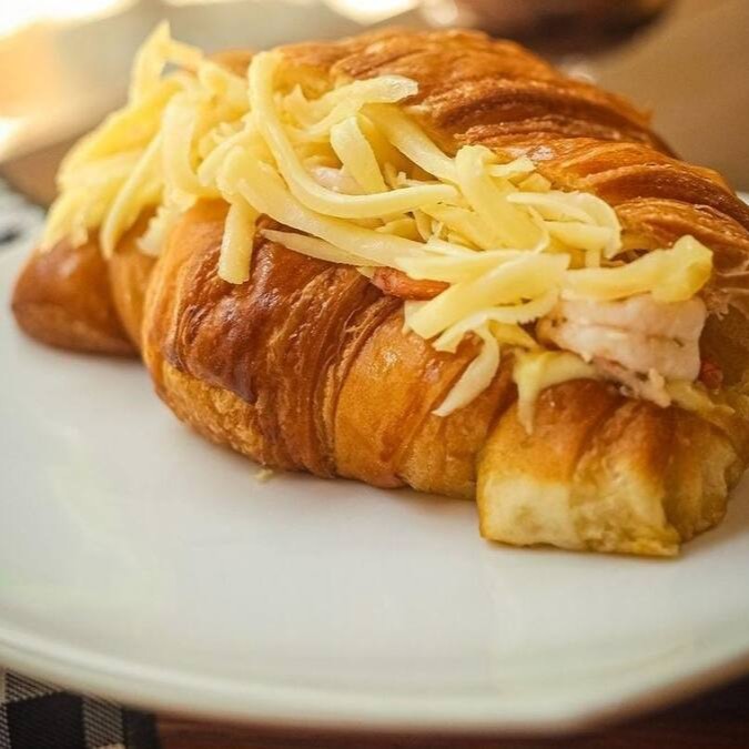 Croissant na chapa com requeijão e frango desfiado.
