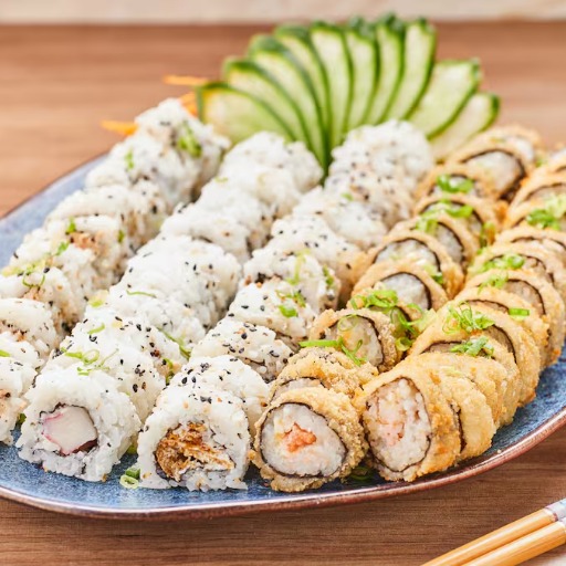 28 peças variadas de: acelga maki de pasta de atum com couve crispy, acelga maki de pasta de salmão com batata crispy e hot roll de pasta de atum empanada com cream cheese e geleia de pimenta.