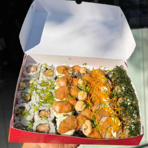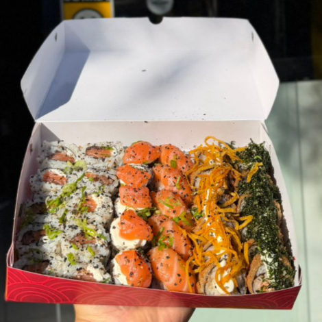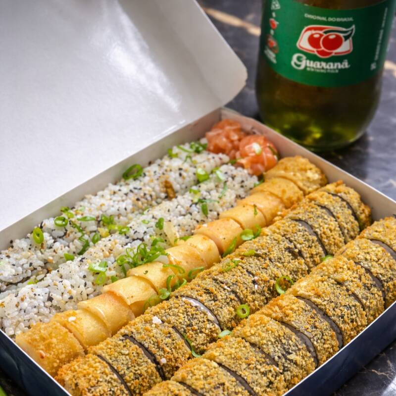 12 carioca de camarão, 12 carioca de kani, 10 uramaki de salmão, 6 hossomaki de camarão empanado.