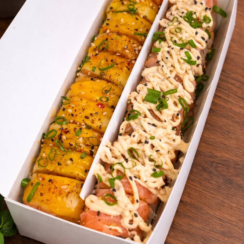 Carioca gigante aberto ao meio, recheado com pasta de salmão, camarão empanado, kani, cream cheese e cebolinho.