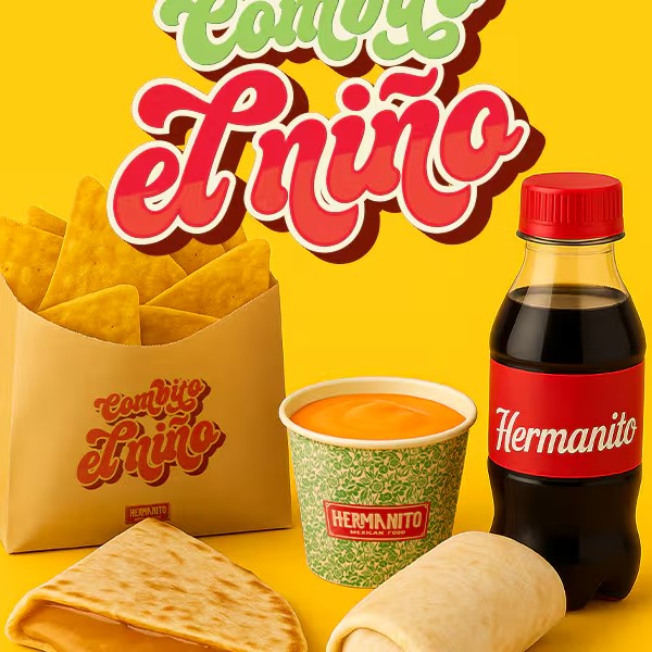 Acompanha um burritinho super saboroso, refrigerante, chips crocantes, cheddar cremoso, mini tortillita doce e ainda uma máscara exclusiva do Hermanito para a brincadeira ficar completa.