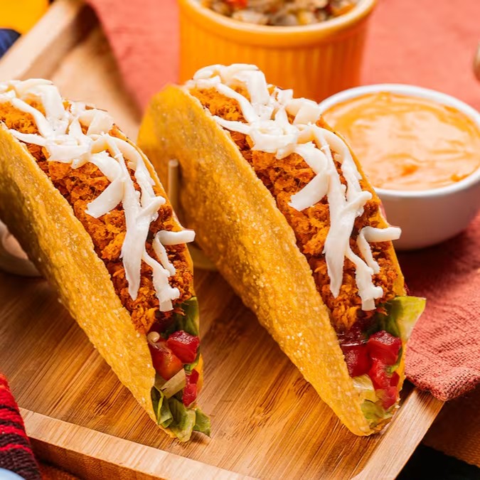 Duas unidades de Tacos a sua escolha | Tacos de milho crocante, alface americana, tomate em cubos, molho Hermanito e queijo mussarela.