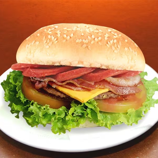 Carne Artesanal 100% Bovina de 110g, tomate, cebola, bacon frito, Queijo, maionese caseira, ovo frito, batata palha, presunto.