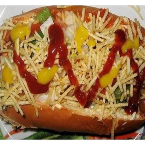 Pão, carne moída, salsicha, batata palha, katchup e maionese caseira