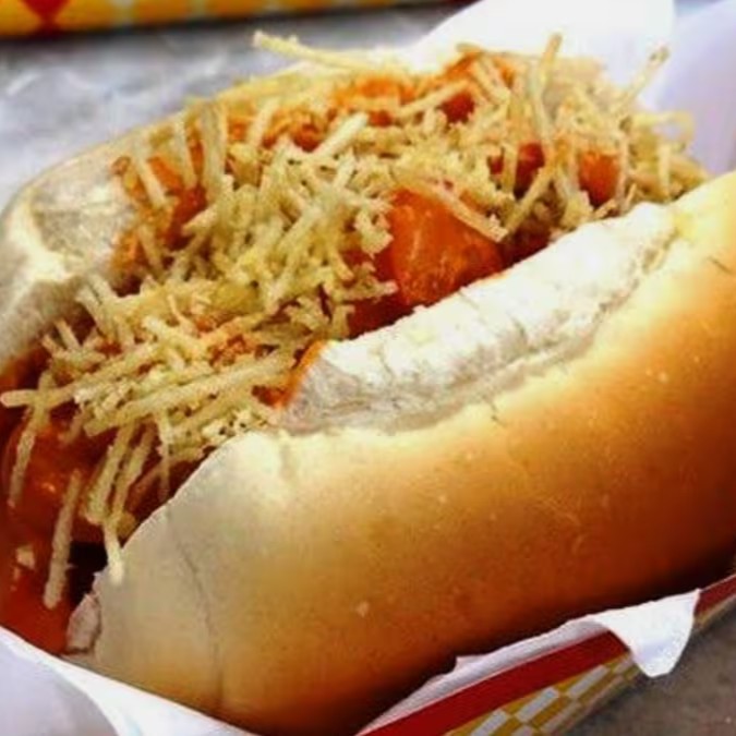 Cachorro quente: salsicha, carne moída, batata palha, maionese caseira, ketchup. Sem vinagrete