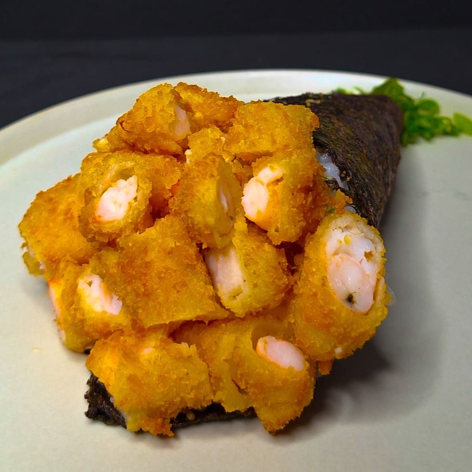 Crocância e cremosidade em perfeita harmonia: camarão empanado dourado, combinado com cream cheese e arroz temperado, tudo envolto em alga crocante. Feito na hora para garantir textura e sabor incríveis.