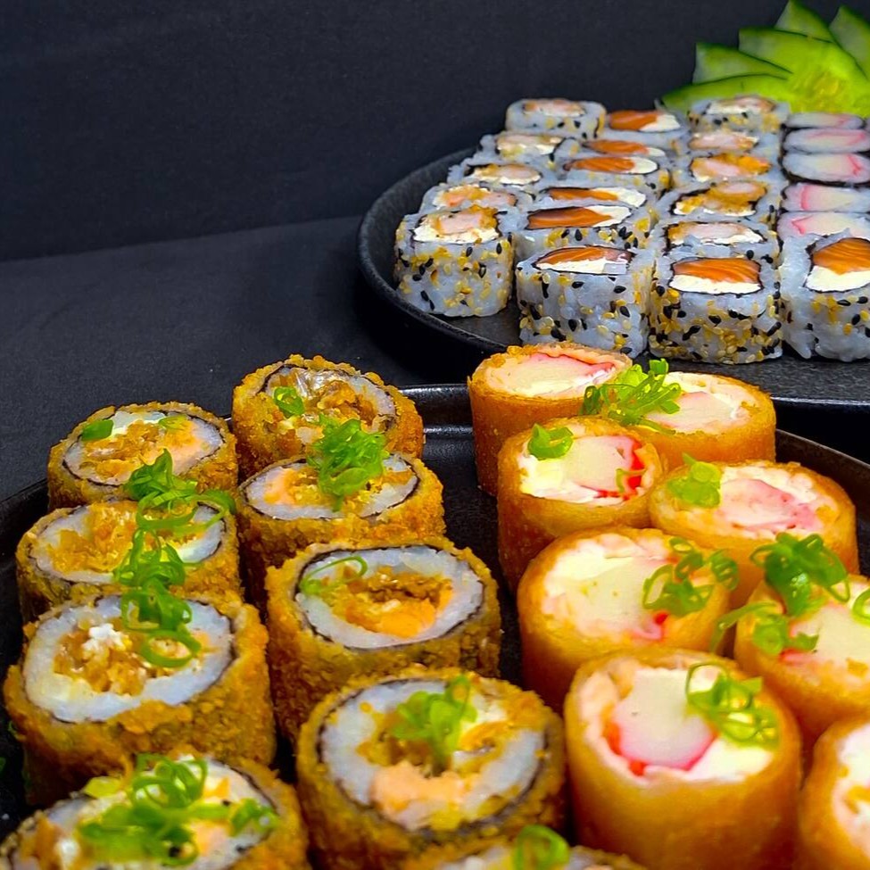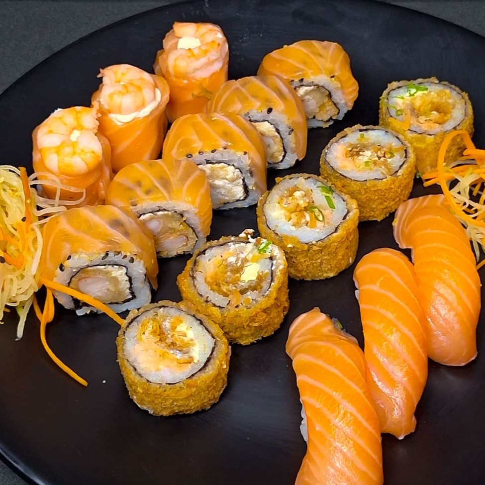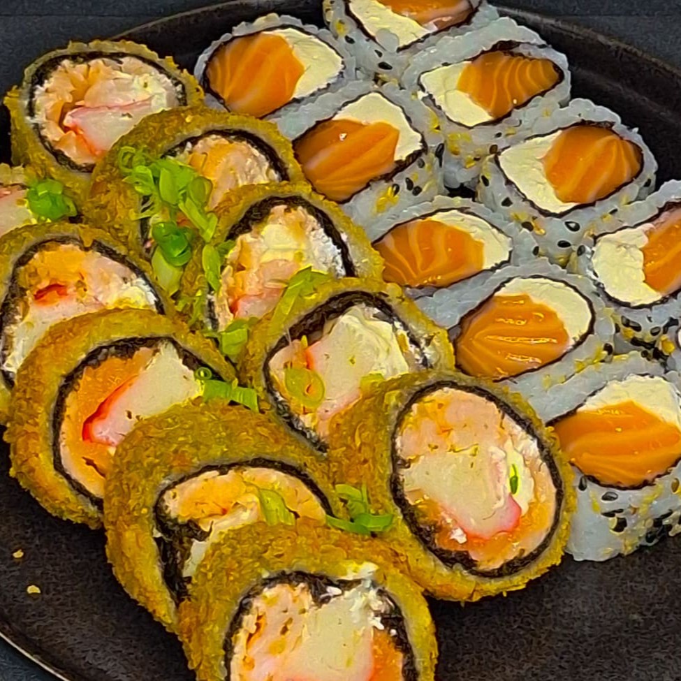 Uma combinação elegante de sabores: 20 peças - 10 uramakis de salmão com arroz temperado e alga nori, e 10 hot Filadélfia recheados com salmão, cream cheese, camarão e kani — sem arroz, crocantes por fora e incrivelmente cremosos por dentro.
