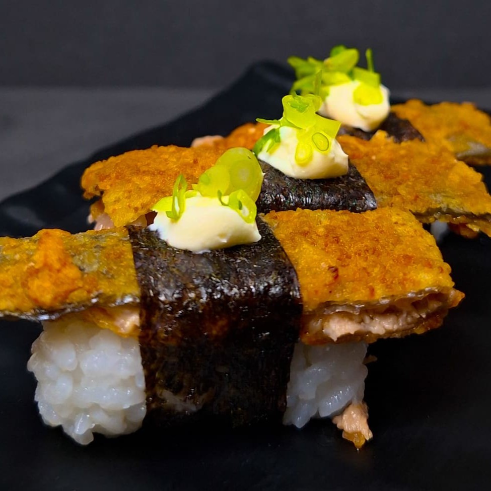 Uma releitura cheia de sabor: base de arroz temperado com uma generosa camada de pele de salmão crocante, finalizada com um toque especial. Textura marcante e sabor intenso em cada mordida.
