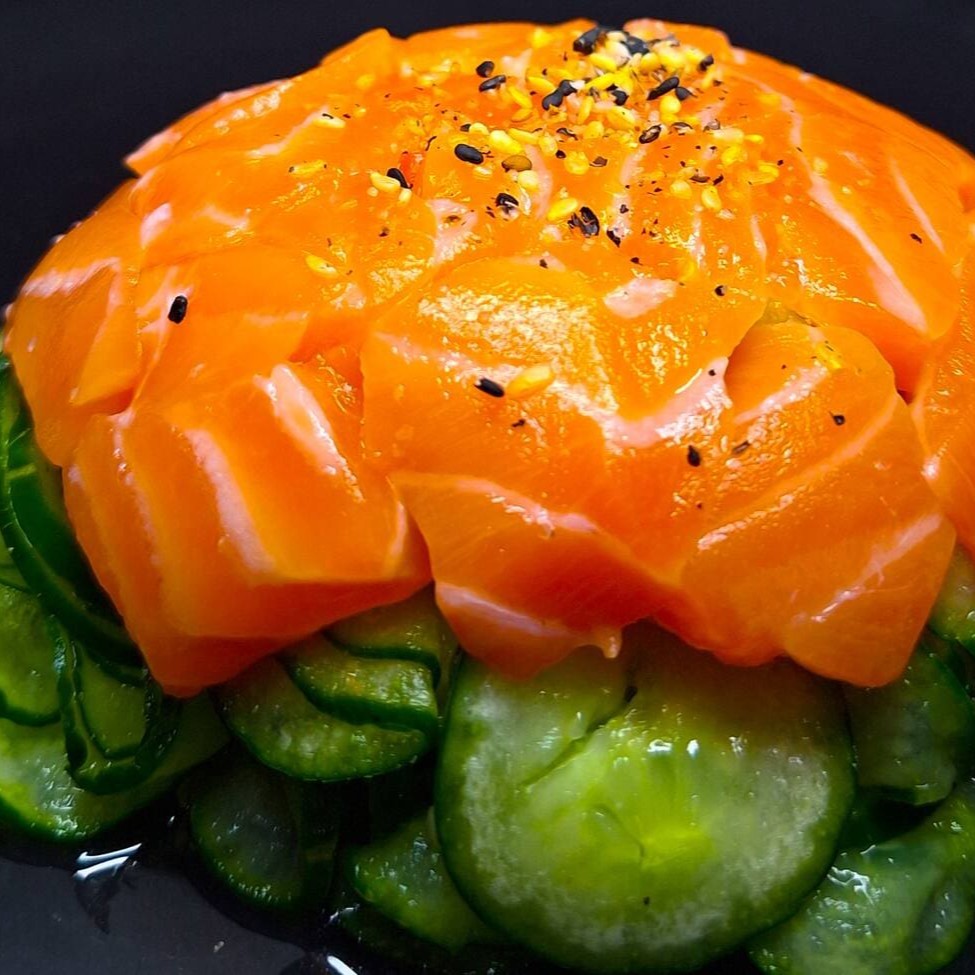 Uma entrada leve e sofisticada: cubos de salmão fresco combinadas com pepino fatiado finamente, marinados no clássico molho agridoce japonês e finalizados com gergelim. Refrescante, equilibrado e cheio de sabor.