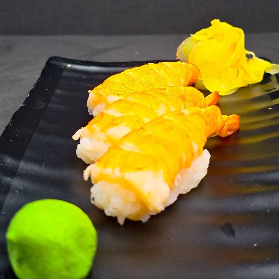 Um clássico delicado e saboroso: camarão cozido cuidadosamente disposto sobre arroz temperado moldado à mão. Textura suave e sabor marcante em uma combinação que honra a tradição japonesa.