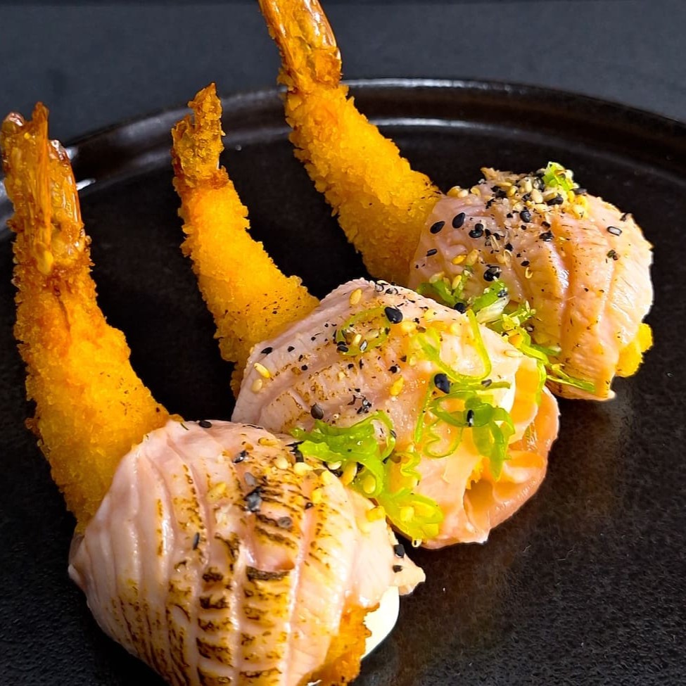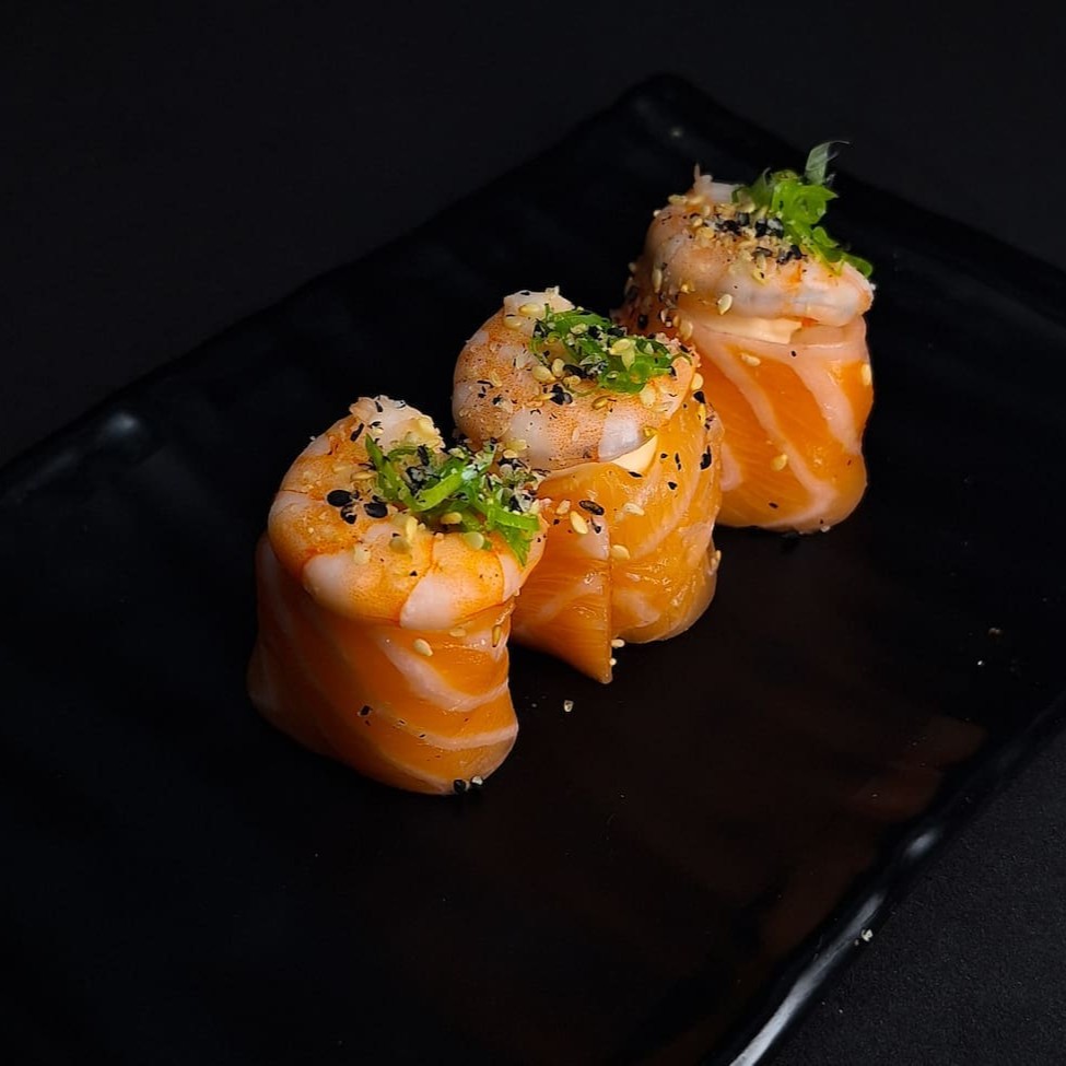 Camarão grande e crocante empanado, envolto por uma delicada lâmina de salmão fresco e cream cheese cremoso. Uma combinação sofisticada que une textura e sabor em cada mordida.