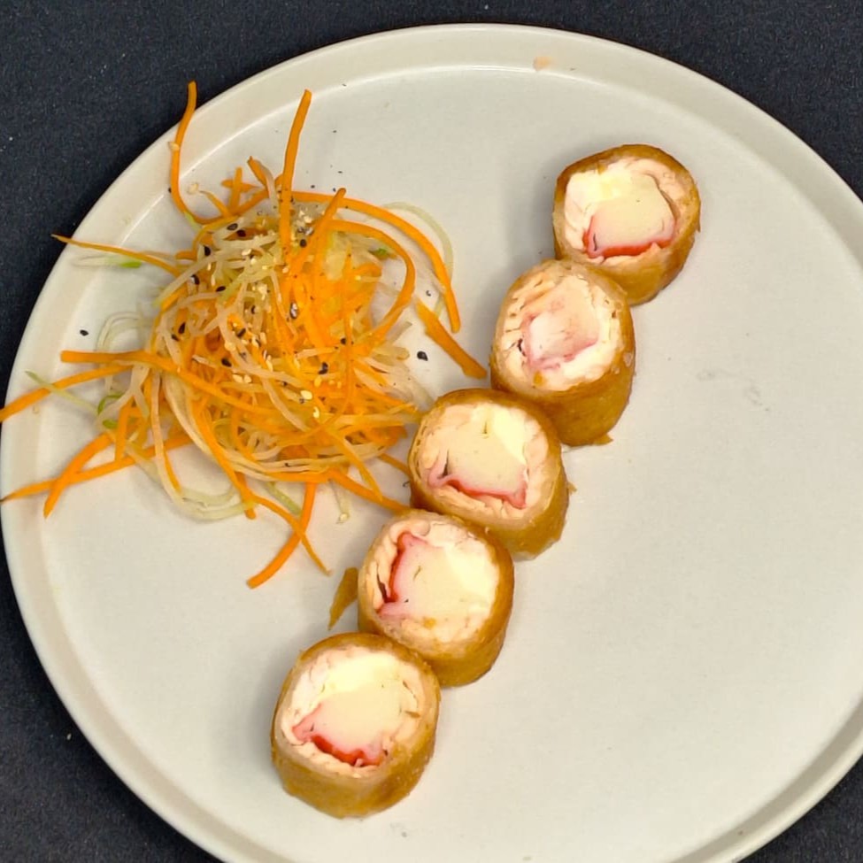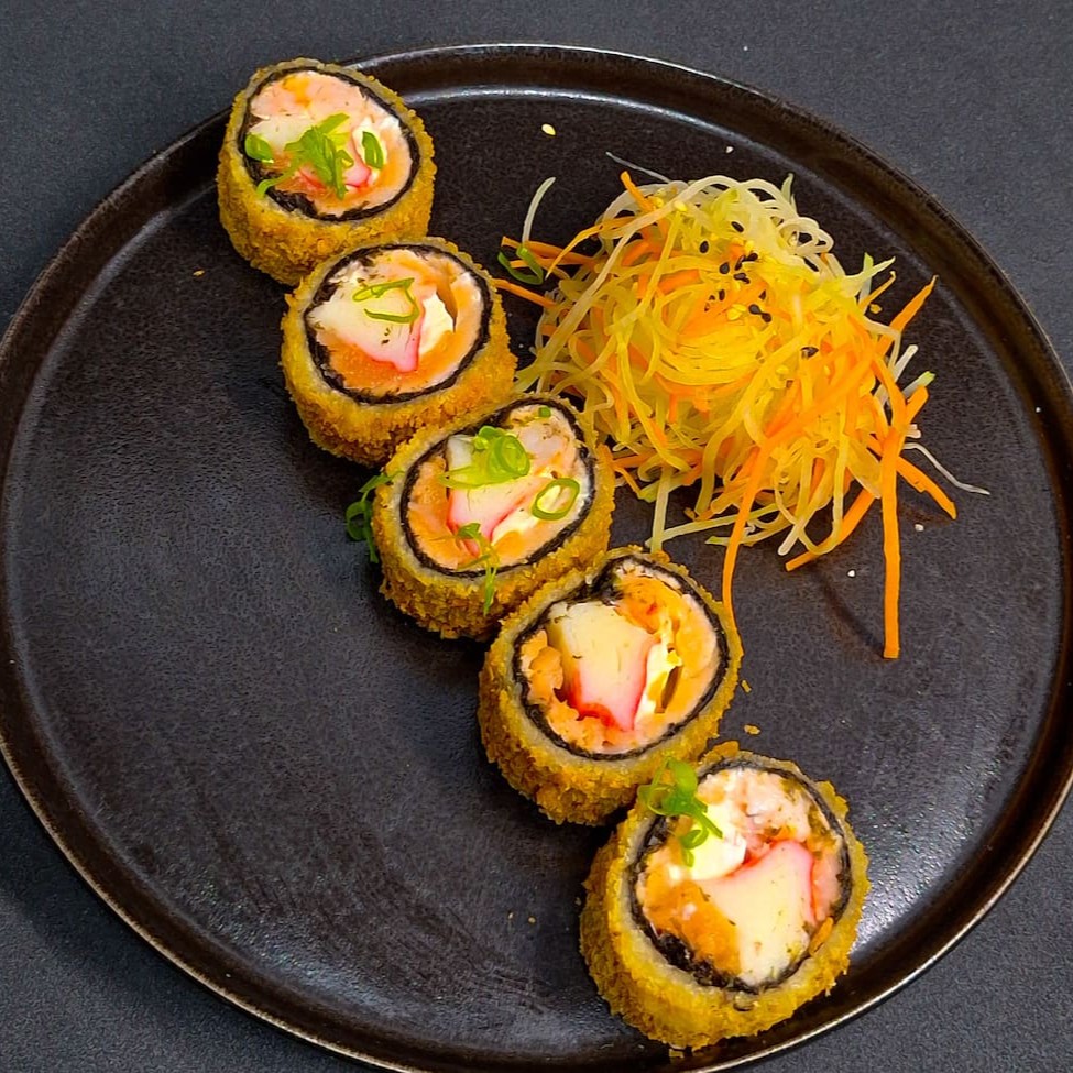 Clássico e irresistível: enrolado empanado e frito, recheado com salmão e cream cheese cremoso. Textura crocante por fora, recheio macio e saboroso por dentro. Uma das opções mais queridas do cardápio!