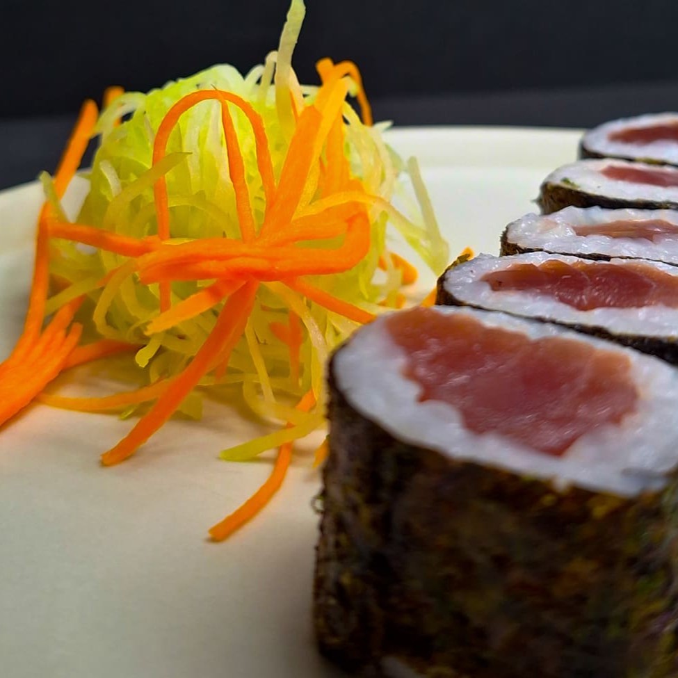 Simples, leve e cheio de personalidade: alga nori envolvendo arroz temperado e atum fresco. Um clássico da culinária japonesa com sabor autêntico e equilíbrio perfeito.