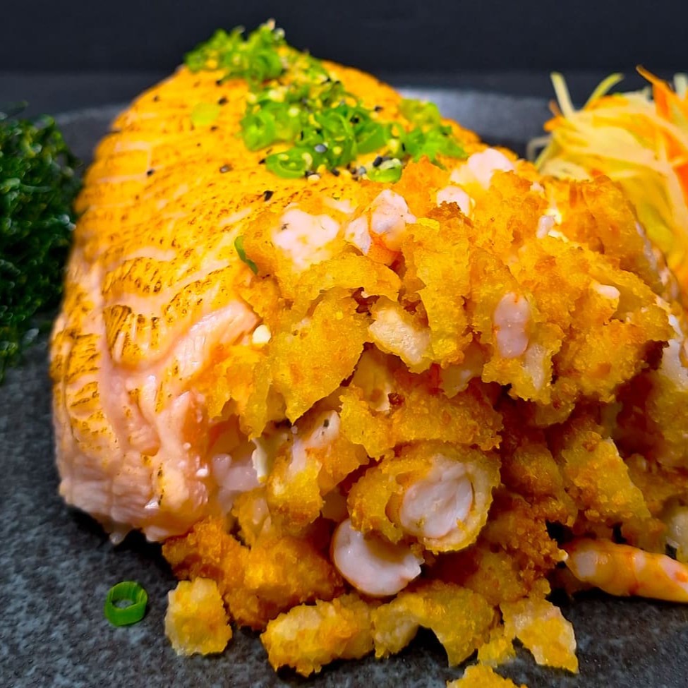 Generosa lâmina de salmão maçaricado, recheada com arroz, camarões empanados, salmão skin empanado e cream-cheese. Finalizado com camarões deliciosamente empanados e crocantes.