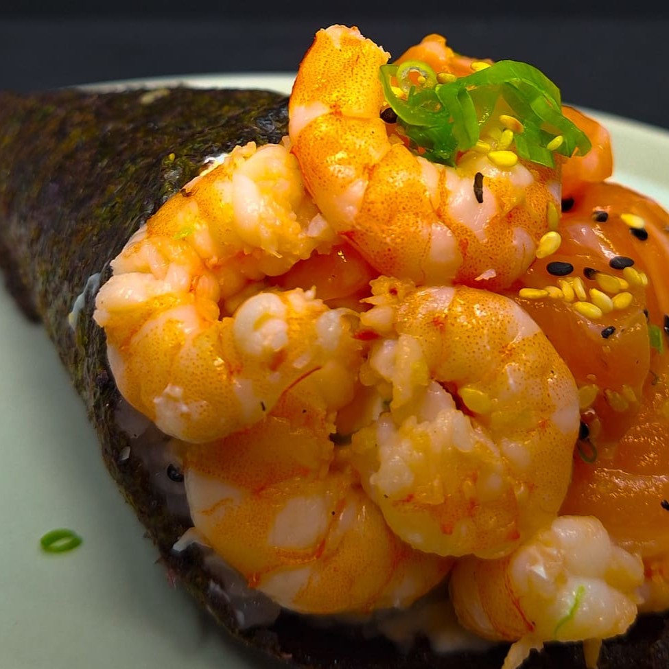Dupla perfeita de sabores: salmão fresco em cubos e camarão empanado crocante, combinados com arroz temperado e alga nori crocante. Um temaki generoso, feito na hora, que une frescor e crocância em cada mordida.