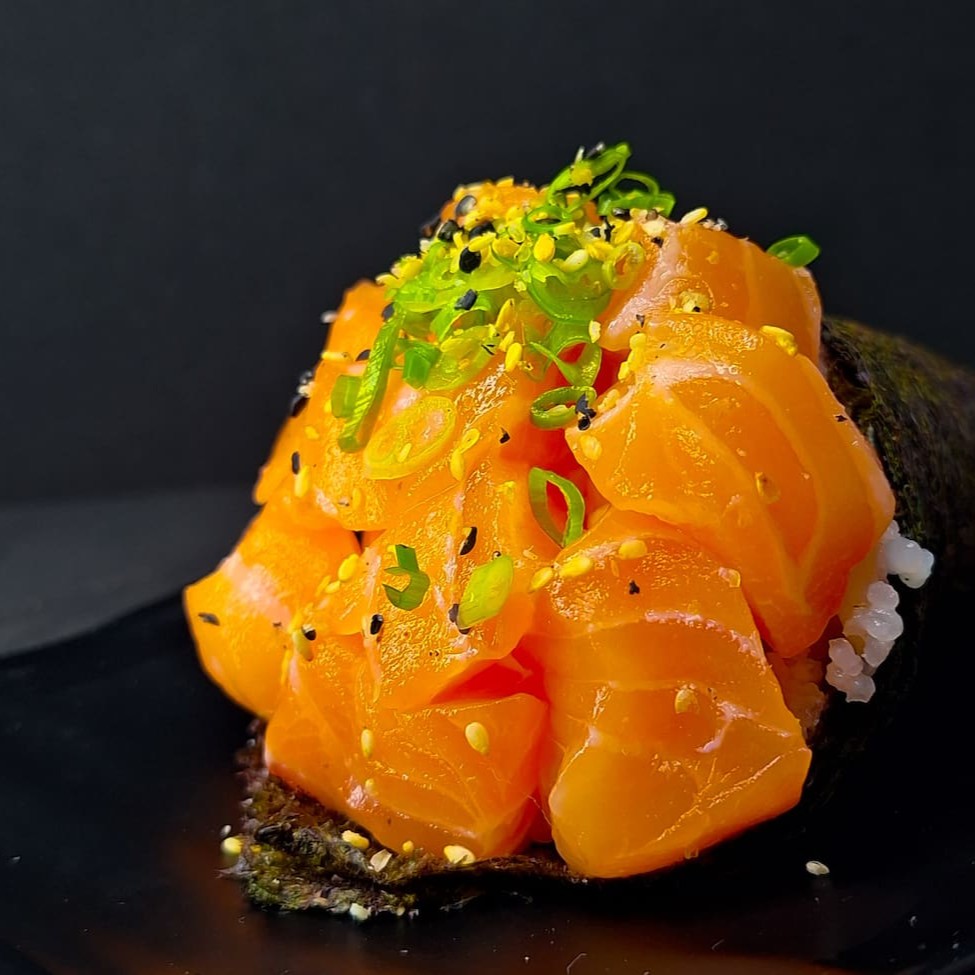 Um clássico que conquista: cubos de salmão fresco com cream cheese, envoltos em arroz temperado e alga crocante. Feito na hora para oferecer frescor e sabor em cada mordida.