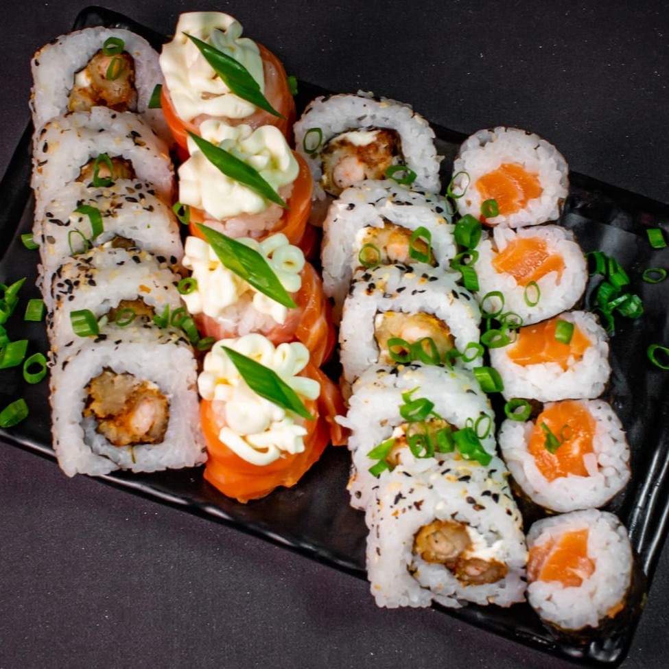 56 peças - Perfeito para dividir com a galera! São 10 uramakis de salmão, 10 uramakis de camarão empanado, 10 cariocas com salmão skin crocante, 8 harumakis especiais (sushi frito na massa harumaki recheado com cream cheese, kani e salmão), 8 hossomakis de kani e 8 hossomakis de atum. Muita variedade e sabor em um combo generoso para compartilhar.