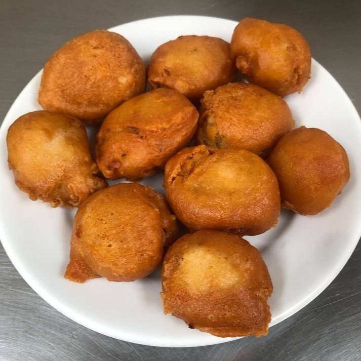 Porção com 10 bolinhas fritas recheadas com cubos de frango e envoltas em uma massa especial.